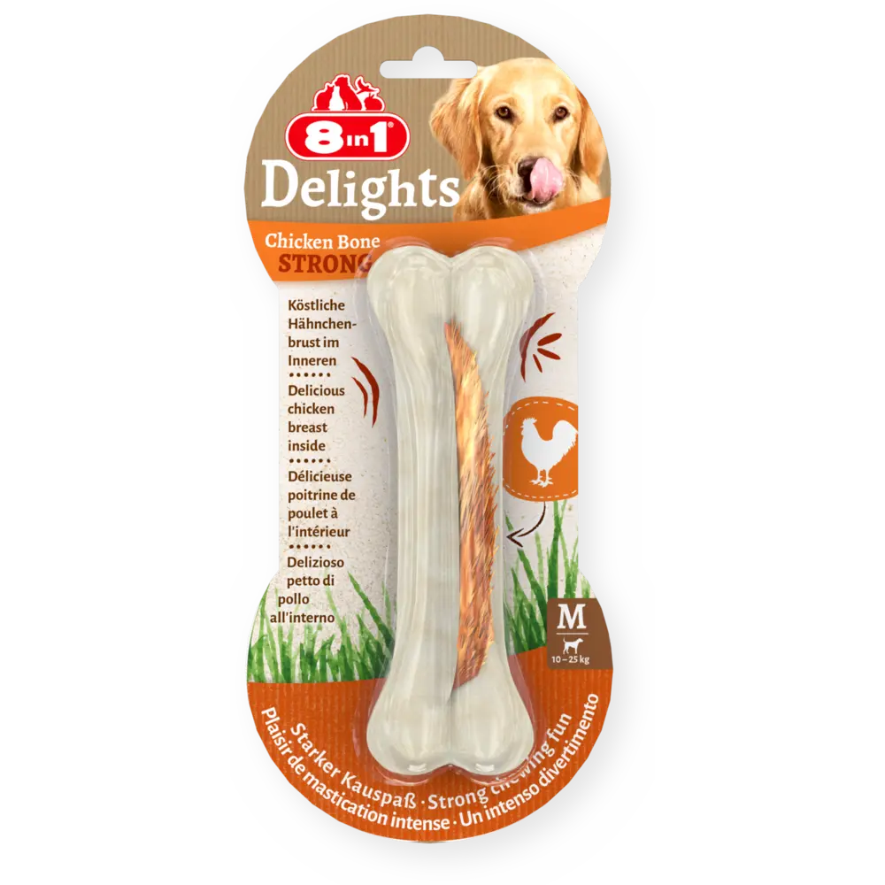 Τα 8in1 Delights Chicken Bones Strong M είναι εξαιρετικά ανθεκτικά κόκκαλα μάσησης, σχεδιασμένα ειδικά για σκύλους μεσαίου μεγέθους με έντονο ένστικτο μάσησης, που ζυγίζουν μεταξύ 10 και 25 κιλών. Συνδυάζουν απολαυστικό βοδινό δέρμα με νόστιμο στήθος κοτόπουλου, προσφέροντας μακράς διάρκειας διασκέδαση και οφέλη για την οδοντική υγεία.