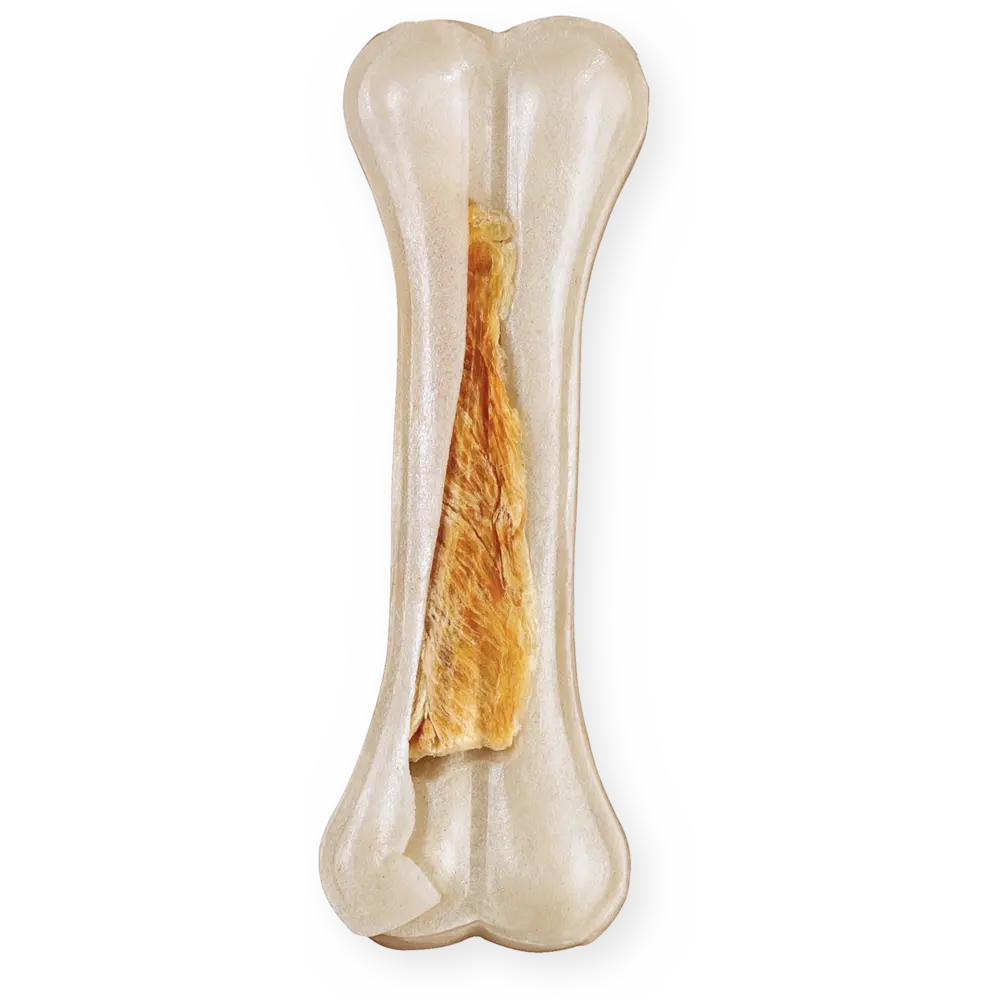 Τα κόκκαλα αποτελούνται κυρίως από βοδινό δέρμα (rawhide) και στήθος κοτόπουλου.