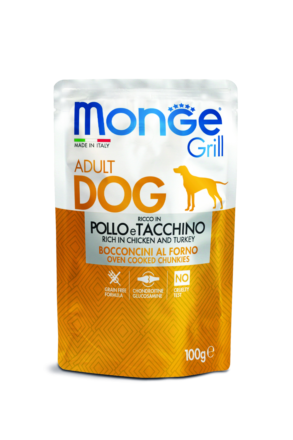 Η Monge Grill Adult Dog Chunks with Chicken and Turkey είναι μια πλήρης, ισορροπημένη και εύγευστη υγρή τροφή για ενήλικους σκύλους. Προσφέρει μια γευστική εμπειρία με κομμάτια κρέατος σε σάλτσα, ψημένα στο φούρνο, με κύρια συστατικά το κοτόπουλο και τη γαλοπούλα.