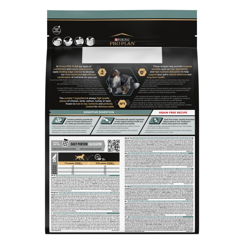 Η Purina Pro Plan Medium & Large Adult Sensitive Digestion Grain Free Turkey είναι μια πλήρης, ξηρή τροφή για ενήλικους σκύλους μεσαίου και μεγάλου μεγέθους (άνω των 10 κιλών), ειδικά σχεδιασμένη για εκείνους με ευαίσθητο πεπτικό σύστημα. Η συνταγή δεν περιέχει σιτηρά, όπως σιτάρι ή καλαμπόκι, και αντ’ αυτών χρησιμοποιεί την μανιόκα ως κύρια πηγή υδατανθράκων. Η τροφή έχει υψηλή περιεκτικότητα σε πρωτεΐνες και περιέχει πρεβιοτικά που συμβάλλουν στη βελτίωση της ισορροπίας της εντερικής χλωρίδας, ενώ η γαλοπούλα αποτελεί το νούμερο ένα συστατικό.