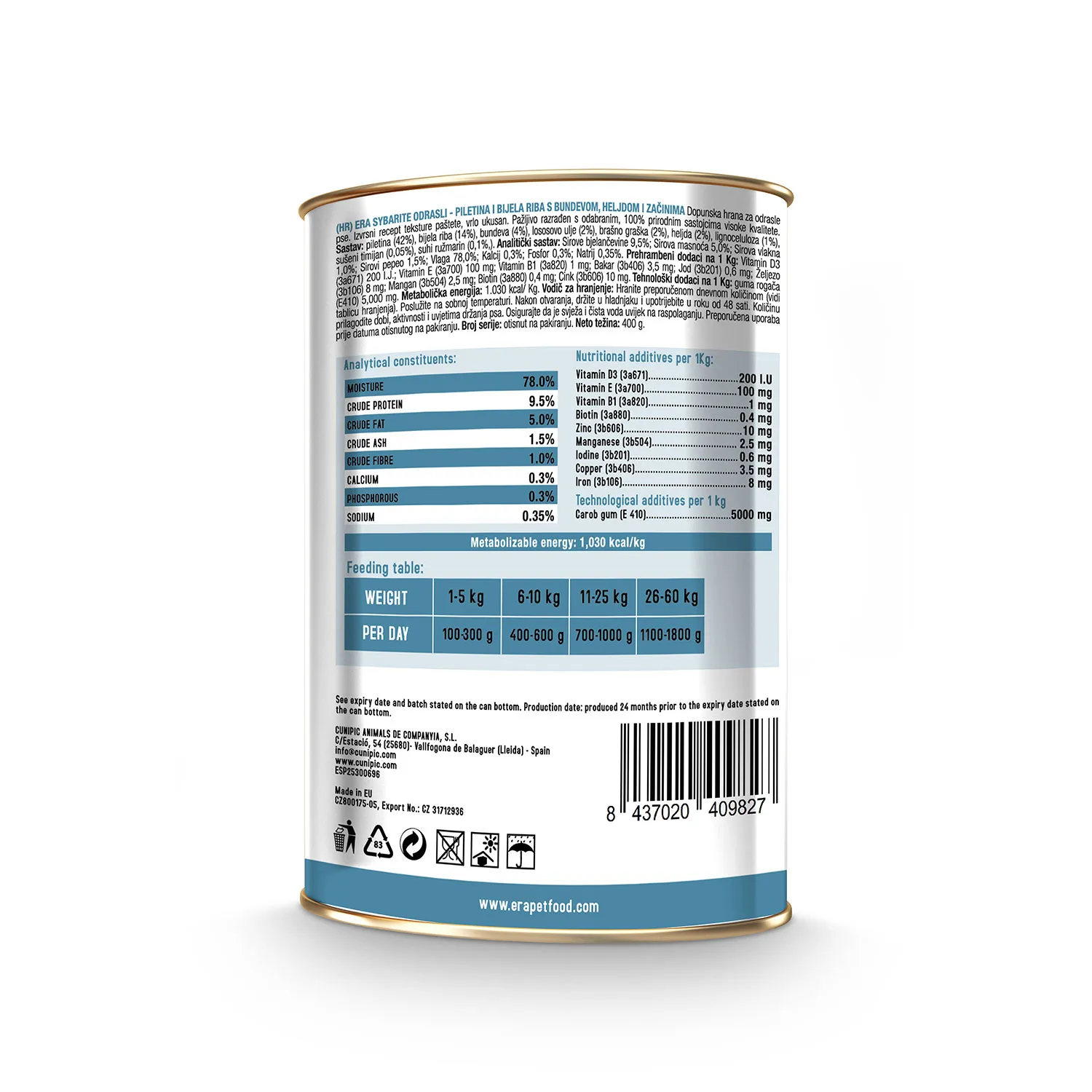 Η υγρή τροφή Era Sybarite Adult με κοτόπουλο, λευκό ψάρι και κολοκύθα είναι ένα υψηλής ποιότητας, υγρό συμπλήρωμα διατροφής για ενήλικους σκύλους. Χάρη στην πλούσια σε πρωτεΐνες συνταγή και την υφή πατέ, προσφέρει μια εξαιρετικά εύγευστη επιλογή που μπορεί να ενσωματωθεί στην καθημερινή διατροφή του σκύλου.