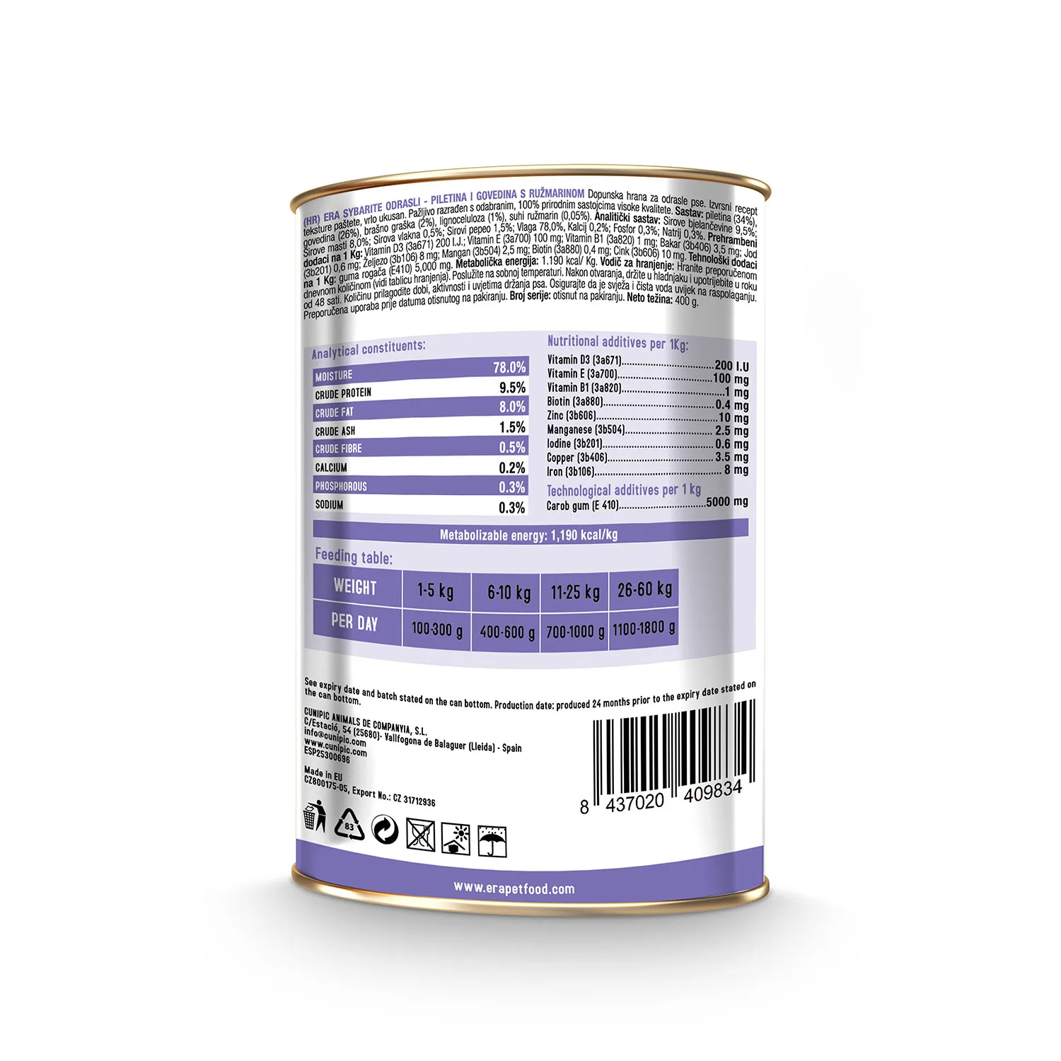 Η υγρή τροφή Era Sybarite Adult με κοτόπουλο και μοσχάρι είναι ένα υψηλής ποιότητας, υγρό συμπλήρωμα διατροφής για ενήλικους σκύλους. Χάρη στην πλούσια σε πρωτεΐνες συνταγή και την υφή πατέ, προσφέρει μια εξαιρετικά εύγευστη επιλογή που μπορεί να ενσωματωθεί στην καθημερινή διατροφή του σκύλου.