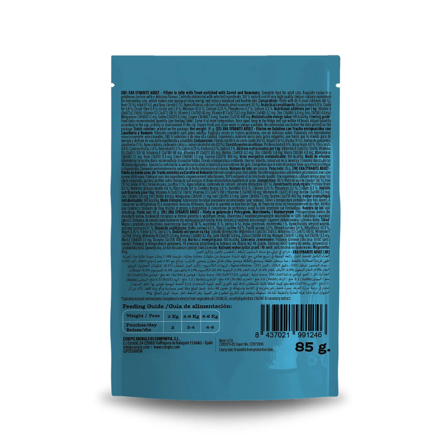 Η υγρή τροφή ERA Sybarite Adult Fillets in Jelly με πέστροφα, καρότο και δεντρολίβανο είναι μια πλήρης και ισορροπημένη διατροφή, ειδικά σχεδιασμένη για ενήλικες γάτες.