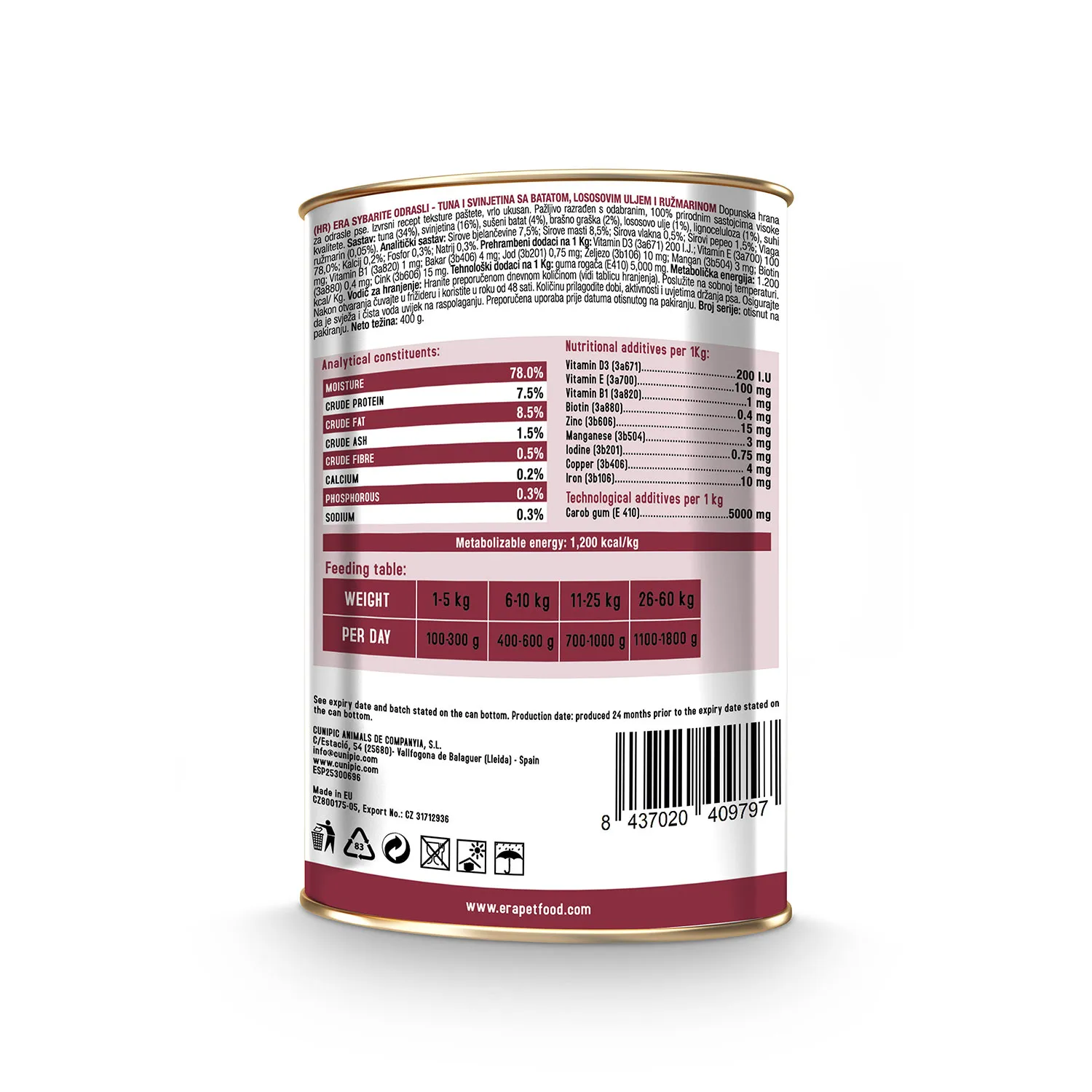 Η υγρή τροφή Era Sybarite Adult με τόνο και χοιρινό είναι ένα υψηλής ποιότητας, υγρό συμπλήρωμα διατροφής για ενήλικους σκύλους. Χάρη στην πλούσια σε πρωτεΐνες συνταγή και την υφή πατέ, προσφέρει μια εξαιρετικά εύγευστη επιλογή που μπορεί να ενσωματωθεί στην καθημερινή διατροφή του σκύλου.