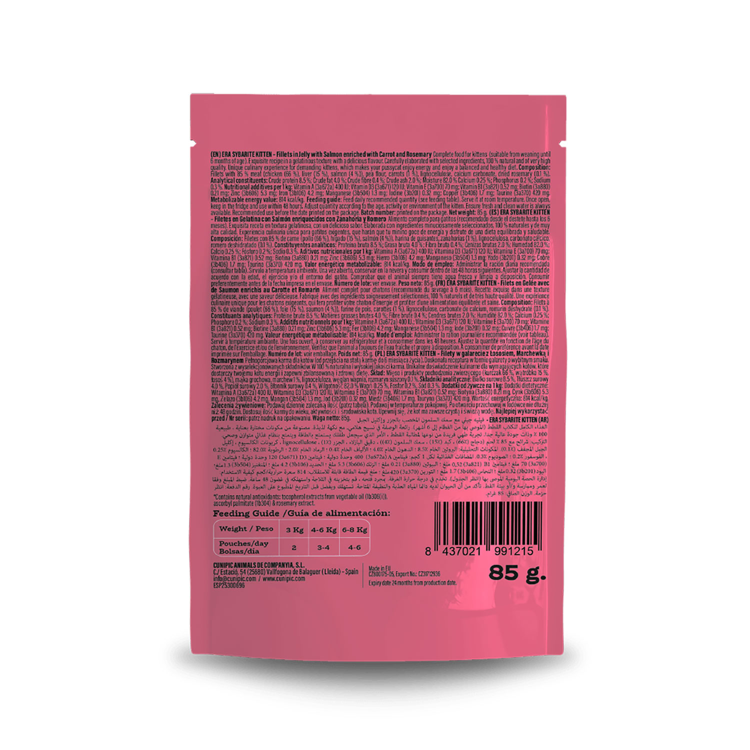 Η υγρή τροφή ERA Sybarite Kitten Fillets in Jelly με σολομό, καρότο και δεντρολίβανο είναι μια πλήρης και ισορροπημένη διατροφή, ειδικά σχεδιασμένη για την ανάπτυξη των γατιών, από τον απογαλακτισμό έως την ηλικία των 6 μηνών.