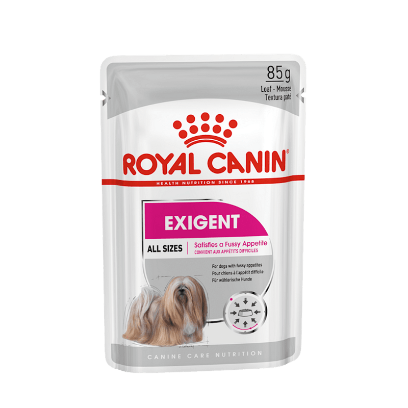 Η Royal Canin Mini Exigent Adult Wet Loaf (ή Πατέ) είναι μια πλήρης υγρή τροφή, ειδικά σχεδιασμένη για ενήλικους σκύλους μικρόσωμων φυλών (ενήλικο βάρος έως 10 κιλά) που είναι επιλεκτικοί στο φαγητό. Διατίθεται σε φακελάκια των 85 γραμμαρίων.