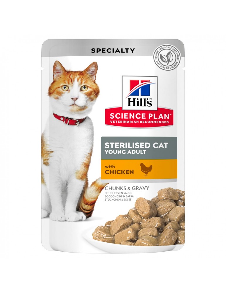 Ακολουθούν αναλυτικές πληροφορίες για την υγρή τροφή Hill’s Science Plan Sterilised Adult με Κοτόπουλο (Tender Chunks in Gravy – Κομμάτια σε Σάλτσα), η οποία είναι σχεδιασμένη για στειρωμένες γάτες ηλικίας 6 μηνών έως 6 ετών.