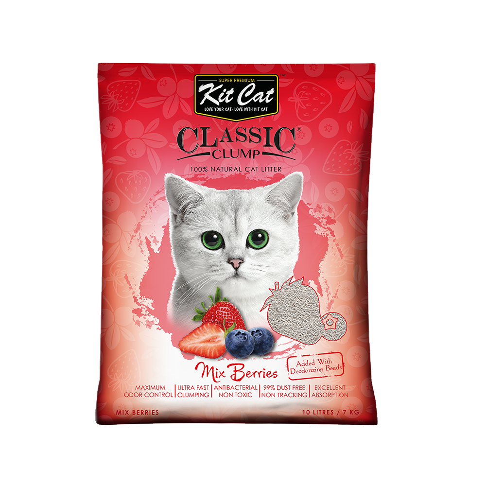 Η άμμος υγιεινής για γάτες Kit Cat Classic Clump με άρωμα μικτών μούρων (Mix Berries), σε συσκευασία 10 λίτρων (7 κιλών), είναι ένα προϊόν υψηλής ποιότητας από την εταιρεία Kit Cat.