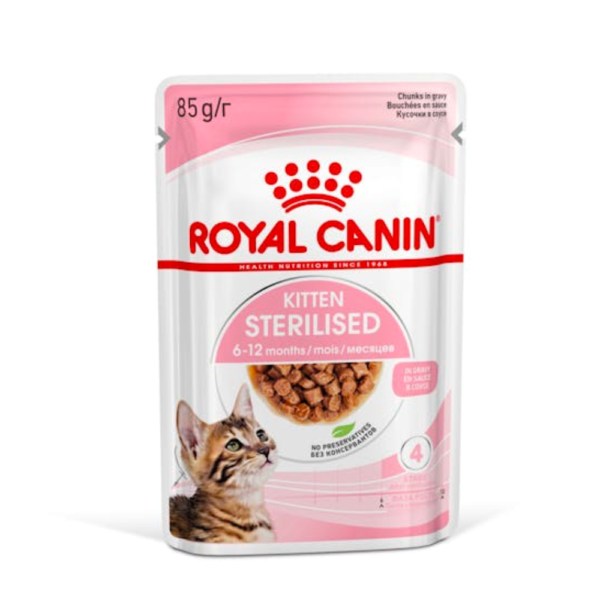 Η Royal Canin Kitten Sterilised in Gravy Pouch 85g είναι μια πλήρης υγρή τροφή, ειδικά σχεδιασμένη για στειρωμένα γατάκια (συνήθως από 6 έως 12 μηνών) κατά την τελική φάση της ανάπτυξής τους.