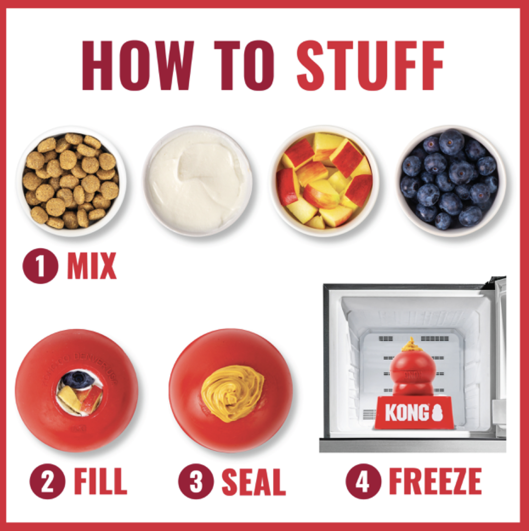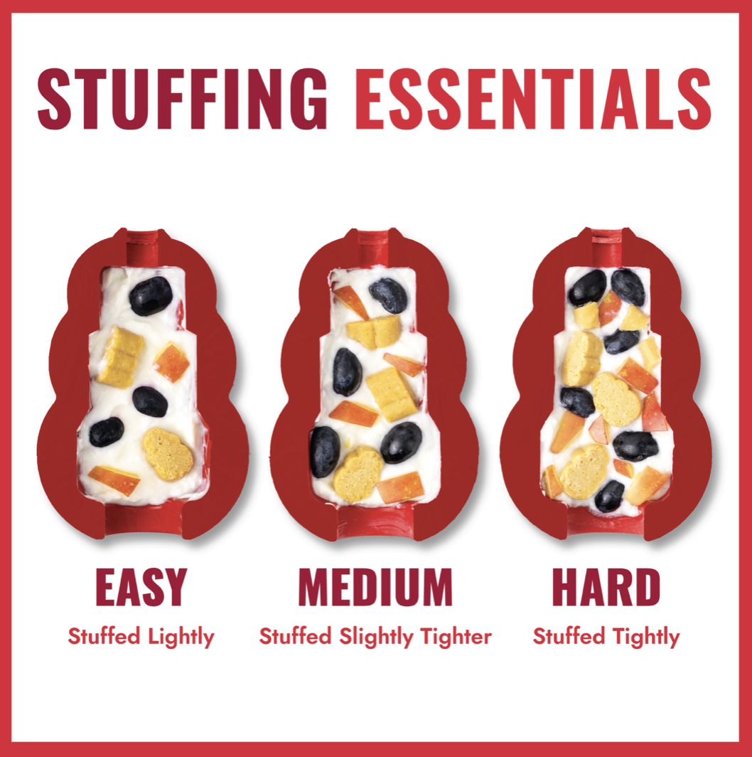 - Συνταγή Γεμίσματος: Ξεκινήστε με κροκέτες, προσθέστε μια στρώση υγρής τροφής ή φυστικοβούτυρο (χωρίς ξυλιτόλη) και σφραγίστε με μια λιχουδιά. KONG Stuffing Guide