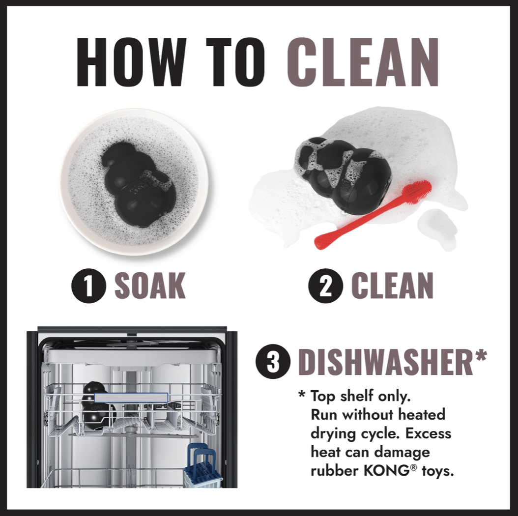 Το KONG Extreme είναι εξαιρετικά εύκολο στον καθαρισμό. Μπορείτε να το τοποθετήσετε στο πλυντήριο πιάτων (πάνω ράφι) για να απομακρύνετε υπολείμματα τροφών και σάλια.