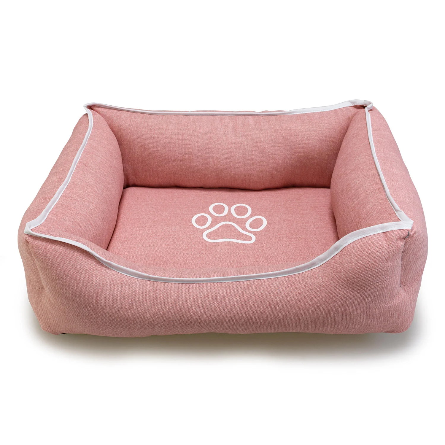 Το τετράγωνο ροζ κρεβάτι της Arquivet (Pink square bed with print and trim) είναι ένα ενισχυμένο κρεβάτι με σχέδιο πατούσας και μπορντούρα, ιδανικό για ξεκούραση, με τα ακόλουθα αναλυτικά χαρακτηριστικά: