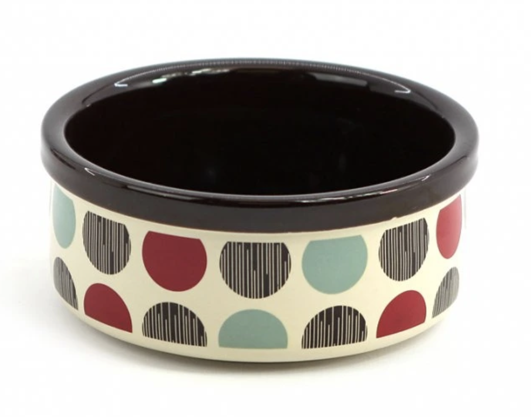 • Το μπολ έχει ένα ελκυστικό, πολύχρωμο (Multi Spot) μοτίβο με βούλες σε χρώματα όπως κόκκινο, μπλε και καφέ, με σκούρο καφέ χείλος και εσωτερικό.
