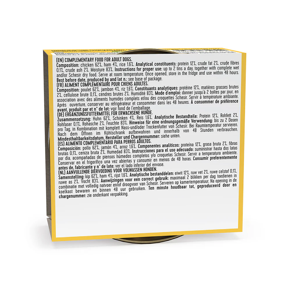 Η υγρή τροφή σκύλου Schesir Dog Chicken With Ham Wet (κοτόπουλο με ζαμπόν) έχει τις ακόλουθες αναλυτικές πληροφορίες και σύνθεση: