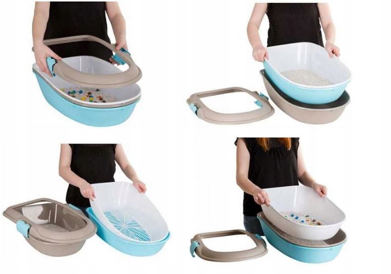 - Αυτοκαθαριζόμενος Μηχανισμός: Το κύριο χαρακτηριστικό της είναι ο διαιρούμενος σχεδιασμός που επιτρέπει τον εύκολο καθαρισμό χωρίς τη χρήση φτυαριού. Αποτελείται από δύο λεκάνες και ένα ειδικό κόσκινο. Ανασηκώνοντας το επάνω μέρος, η καθαρή άμμος κοσκινίζεται, ενώ τα ακάθαρτα μένουν στο κόσκινο για εύκολη απόρριψη.