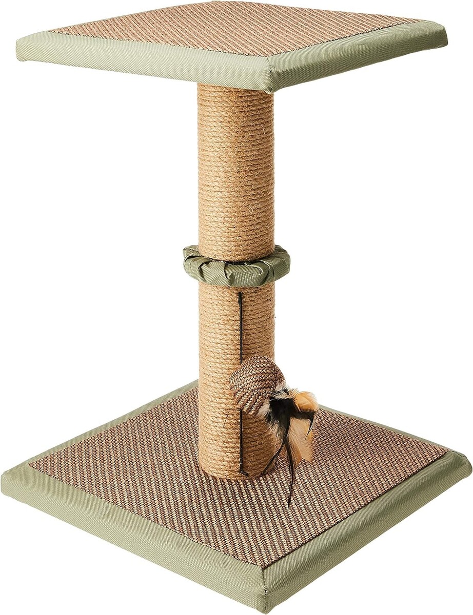 - Υλικά: Η κεντρική κολόνα ξυσίματος είναι τυλιγμένη με ανθεκτικό θαλάσσιο γρασίδι (seagrass) ή σιζάλ, υλικά που προσελκύουν τις γάτες και είναι ιδανικά για να ακονίζουν τα νύχια τους. Η βάση και η πλατφόρμα είναι καλυμμένες με ύφασμα.