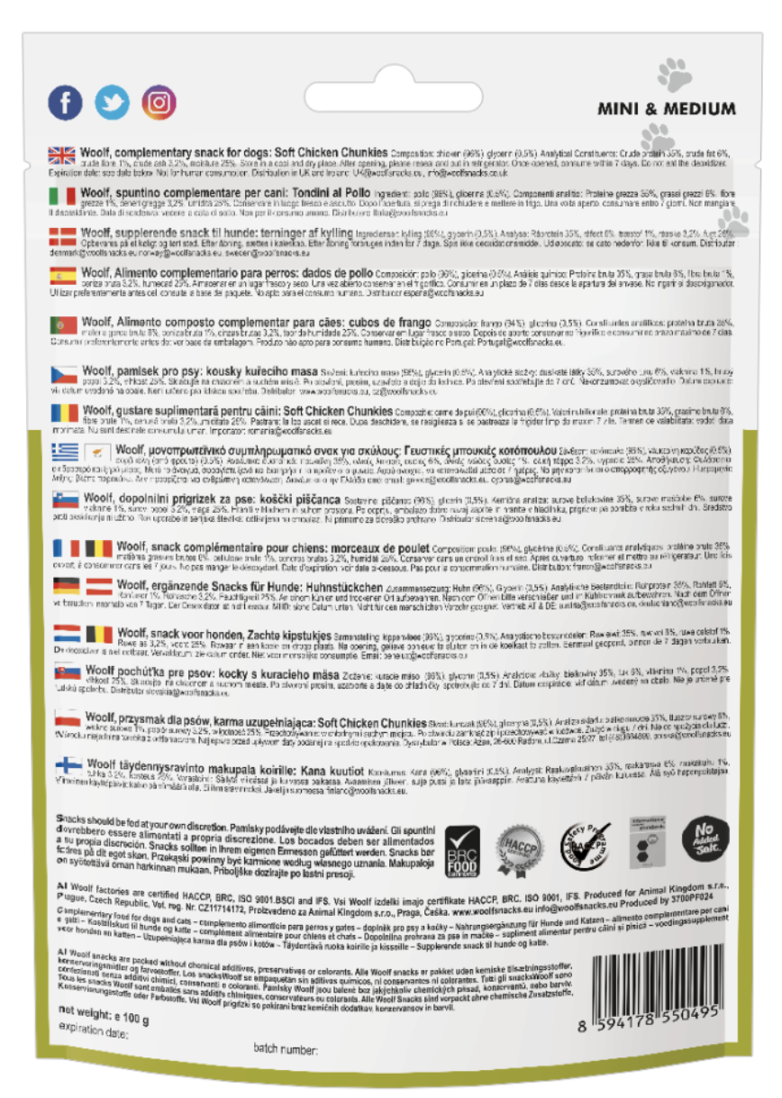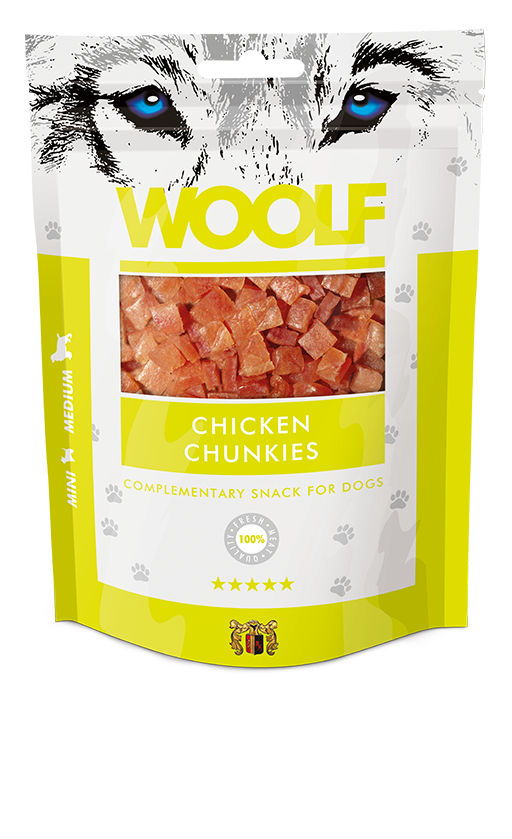 Οι λιχουδιές Woolf Chicken Chunkies είναι ένα 100% φυσικό σνακ σε μορφή μικρής μπουκιάς, ιδανικό για την εκπαίδευση και την επιβράβευση σκύλων και γατών.