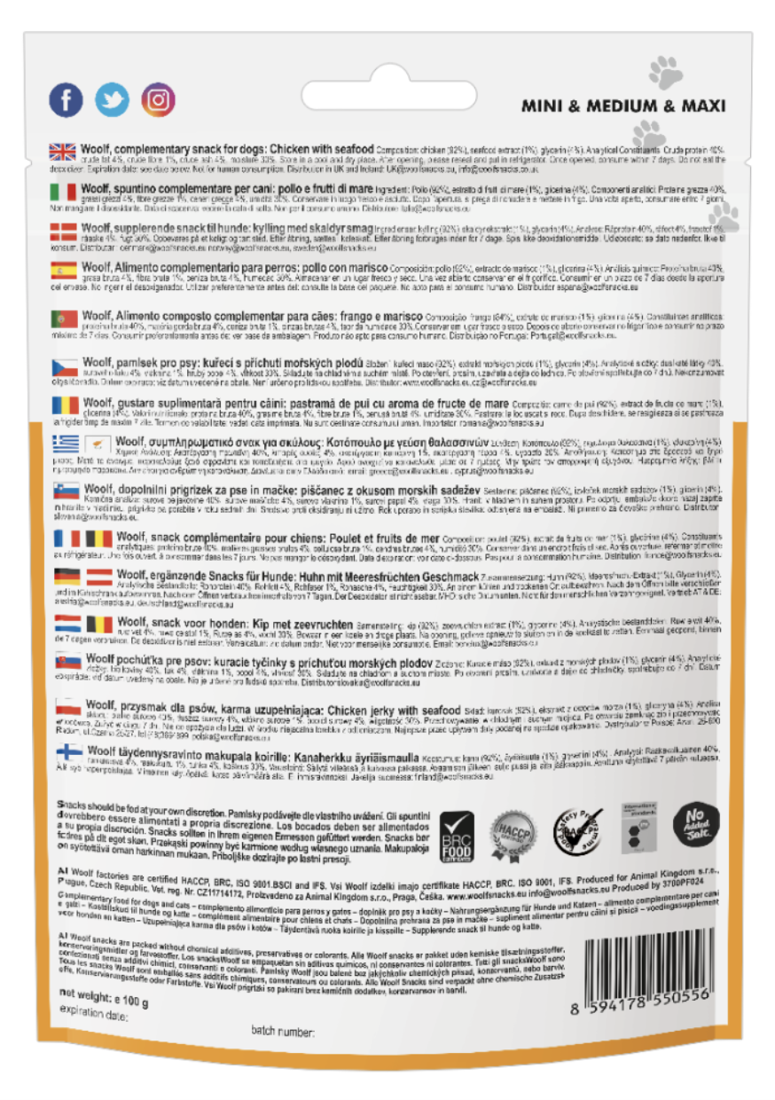 Οι λιχουδιές Woolf Chicken with Seafood είναι ένα 100% φυσικό σνακ υψηλής ποιότητας, σχεδιασμένο για σκύλους όλων των μεγεθών, ενώ είναι κατάλληλο και για γάτες.