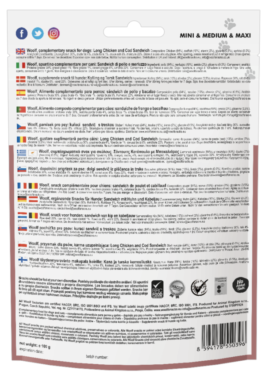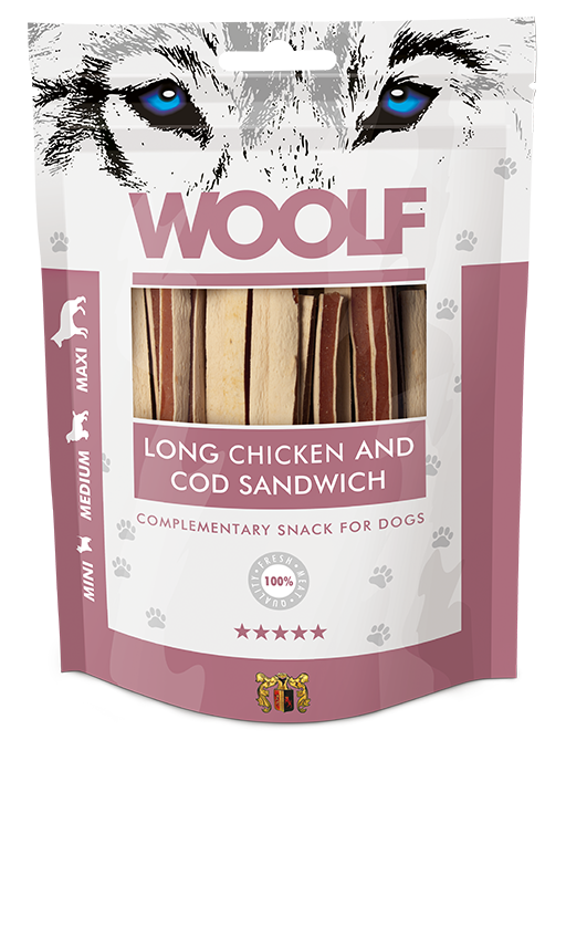 Οι λιχουδιές Woolf Long Chicken and Cod Sandwich είναι ένα 100% φυσικό σνακ σε μορφή μακριάς λωρίδας, που συνδυάζει το κοτόπουλο με τον μπακαλιάρο για μέγιστη γευστικότητα και θρεπτική αξία.